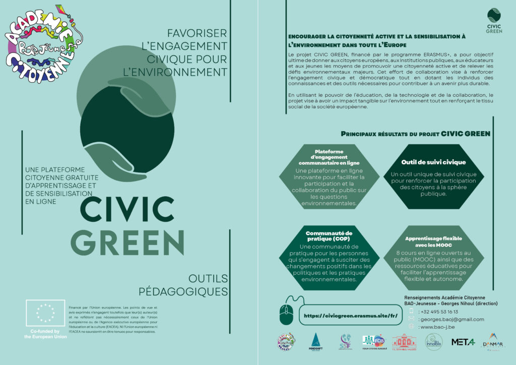 L’Académie Citoyenne BAO-Jeunesse participe au projet européen Civic Green, soutenu par le programme ERASMUS+, qui vise à renforcer la participation des jeunes aux enjeux environnementaux et climatiques à travers l’éducation non formelle, la citoyenneté active et l’initiative collective.